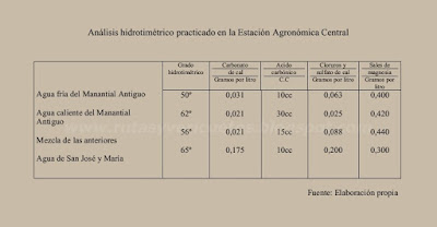 (dureza de las aguas) de los dos manantiales, junto con un estudio por separado de las aguas frías y calientes de la Acequia Vieja